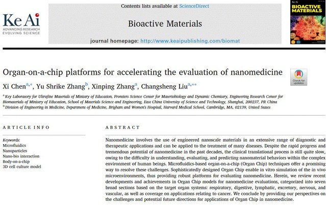 生物材料研究中心刘昌胜院士/陈曦副教授在《Bioactive Materials》(《生物活性材料》)上发表题为‘Organ-on-a-Chip Platforms for Accelerating the Evaluation of Nanomedicine’的综述文章。