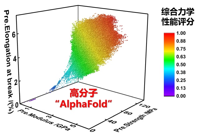 图1. 面向高性能环氧树脂设计的“AlphaFold”模型,可高效、快速计算不同分子结构环氧树脂的强度、模量和断裂伸长,性能3D图中包涵24万个环氧结构的强度、模量和断裂伸长。颜色由紫到红表示综合力学性能的由弱到强。