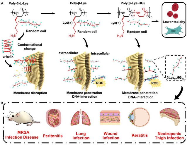 刘润辉教授课题组在治疗耐药菌感染研究中,以抗菌作用机理作为设计策略,通过模拟宿主防御肽设计发现了对耐甲氧西林金黄色葡萄球菌(MRSA)具有高效抗菌活性的β−多肽聚合物。该成果以“Switching from membrane disrupting to membrane crossing, an effective strategy in designing antibacterial polypeptide”为题发表在《科学·进展》(Science Advances, 2023, DOI: 10.1126/sciadv.abn0771)。