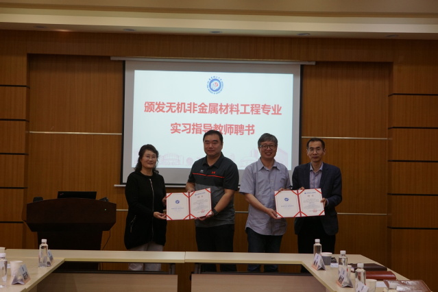 会上,苏建玲、顾金楼为玻78班校友、信义玻璃技术总监陈建军,无材042班校友、奥镁集团中国及东亚区玻璃业务副总裁占磊颁发无机非金属材料工程专业实习指导教师聘书。