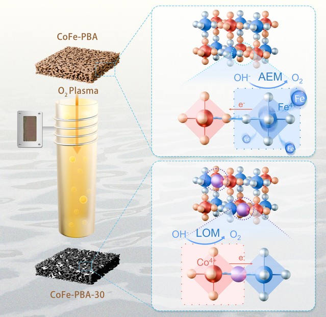 研究团队创新性地采用高功率氧等离子体处理技术,精确调控了CoFe双金属普鲁士蓝类似物(PBA)析氧催化剂的局域原子近程结构:在保留PBA晶体结构框架的同时,通过破坏局域氰基配体并引入氧原子,成功构建了Co-O-Fe的结构基元,进而将析氧反应路径从传统的吸附物演化反应机制(AEM)调节为动力学更优的晶格氧氧化反应机制(LOM)。