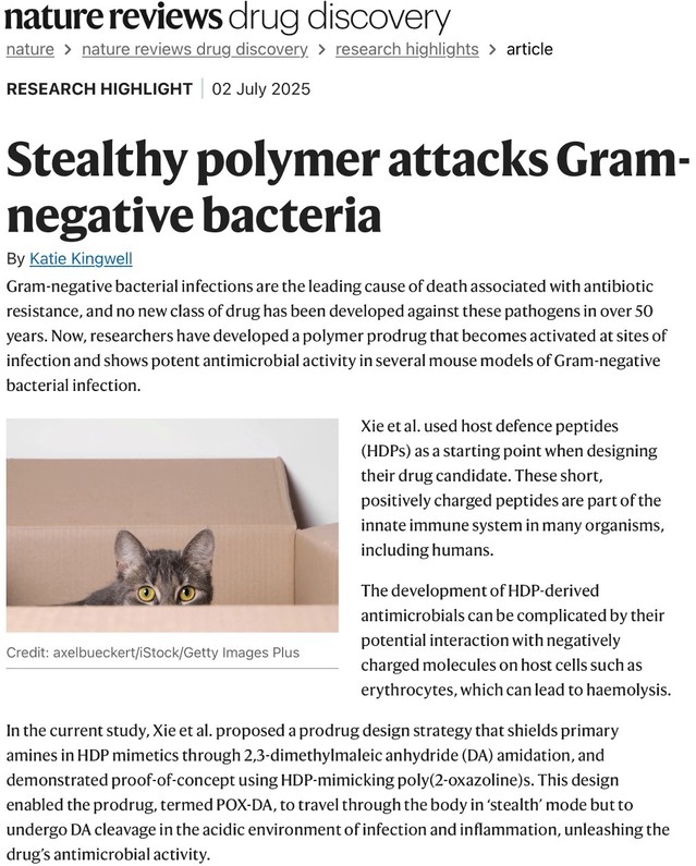刘润辉教授课题组报道了一种感染部位原位激活的宿主防御肽模拟前药设计策略,在实现“生理环境隐形、感染部位激活”响应性精准抗感染治疗的同时,还可将原本因毒性和生物利用度等问题受限的多肽类化合物转化为具有体内应用潜力的候选药物分子。相关成果以“A host defense peptide-mimicking prodrug activated by drug-resistant Gram-negative bacterial infections”为题,以封面文章发表在ScienceTranslational Medicine(Sci. Transl. Med.2025, 17, 801, eadl4870)。该成果刚刚被国际权威学术期刊Nature Reviews Drug Discovery作为研究亮点报道(//doi.org/10.1038/d41573-025-00118-7)。