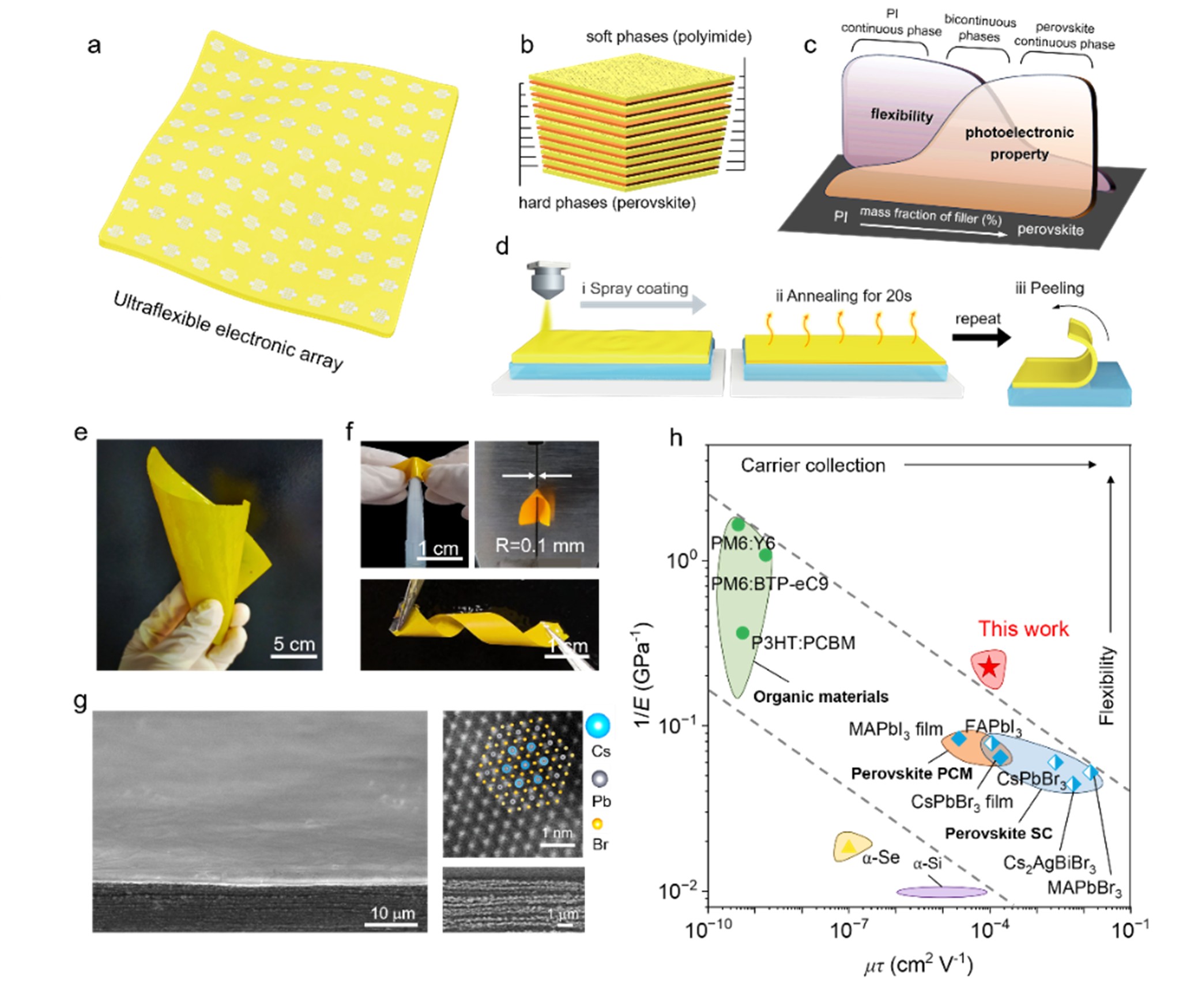 针对上述问题,研究团队提出周期性聚合物-钙钛矿有序薄膜材料的设计理念,利用循环喷涂工艺,并通过对有机-无机相分离过程的精准调控,成功制备超柔性层状复合自支撑膜材料。该复合膜材料展现出类似塑料的力学行为,即较低的杨氏模量(5.41 GPa)和极强的弯曲耐受性(弯曲半径达0.5 mm),同时保留了钙钛矿面内优异载流子输运能力(迁移率寿命积达1.04×10⁻⁴ cm² V⁻¹)。