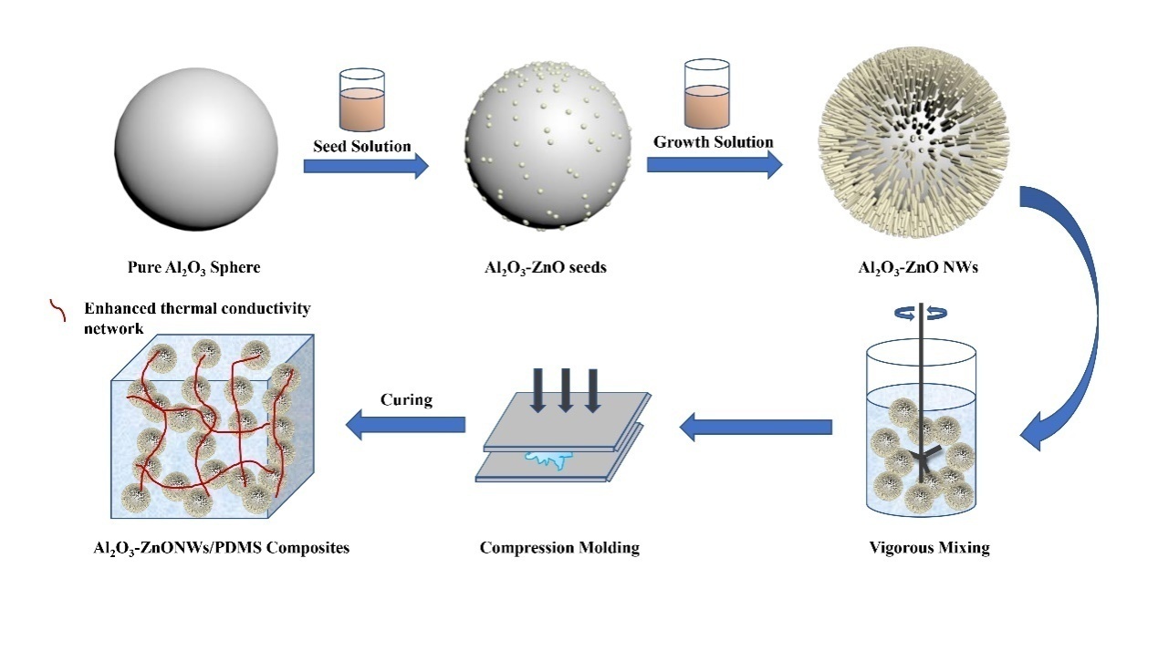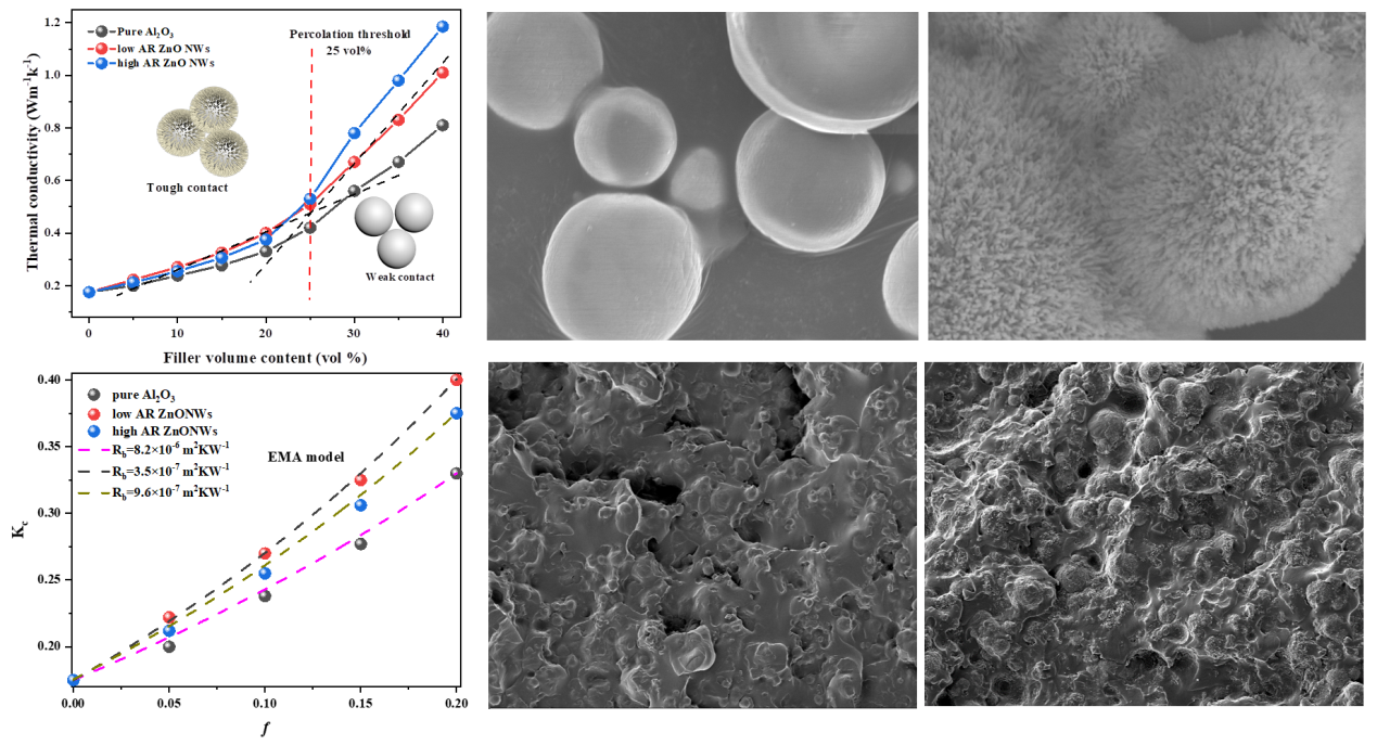 吴唯教授课题组利用仿生纳米工程,实现了“一维”氧化锌纳米线(ZnONWs)在“零维”微米氧化铝(Al2O3)表面的可控组装,制备出了新型“海胆状”微纳杂化陶瓷填料Al2O3-ZnONWs。由于表面含有大量类针状结构的ZnONWs,毗邻Al2O3之间的接触状态由“单点接触”转变为“多点接触”,使得聚合物内部导热通路的数量及密度得到大幅度提高,从而促进了热量在整个TIMs中的扩散。其次,ZnONWs构成的纳米级梯度相界面明显降低了柔性基体硅橡胶与Al2O3之间因弹性模量不匹配而产生的高额界面边界热阻,提高了热量在聚合物/填料边界上的传递效率。加入该高长径比Al2O3-ZnONWs后,使硅橡胶的导热系数提高了577%。与此同时,纳米梯度ZnONWs相界面引起的空间位阻效应还有效提高了TIMs的热稳定性及基础力学性能。这一工作系统阐述了Al2O3-ZnONWs这一新型杂化导热填料的制备理论,揭示了其在聚合物内部的热量传输机制,为高性能柔性聚合物基热界面材料(TIMs)的制备提供了理论依据,可有效解决目前高集成化芯片所面临的散热效率不高的问题。