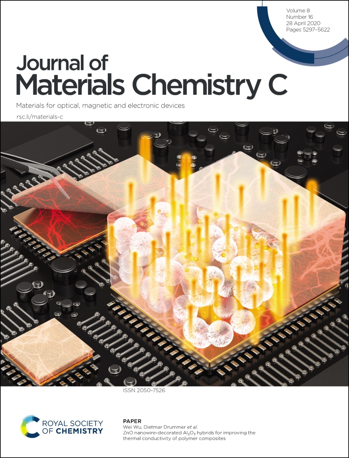 吴唯教授课题组通过实现多维微纳陶瓷填料的可控组装,在应用于芯片与散热器之间高性能柔性聚合物基热界面材料研究领域取得重要进展。相关成果以“ZnO nanowire-decorated Al2O3 hybrids for improving the thermal conductivity of polymer composites”为题,以封面论文形式,发表在最新一期国际著名材料科学期刊《Journal of Materials Chemistry C》上(Journal of Materials Chemistry C, 2020,8(16):5380-5388. DOI:10.1039/C9TC06805H)。