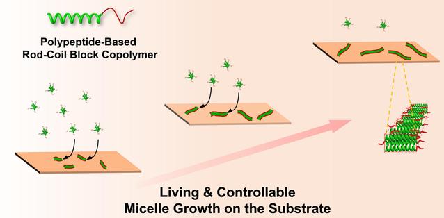 近期,团队发现了高分子胶束在基板上的“平躺”活性生长,这是一类全新的超分子聚合机制。研究发现,液晶嵌段共聚物在溶液中首先形成胶束,其中一些胶束吸附到基板表面成核并作为种子,这些胶束种子具有活性末端,并通过与溶液中剩余胶束的融合,诱导一维柱状胶束在基板上的活性生长。理论模拟进一步揭示了这一过程与基板对胶束的锚定作用和胶束核内液晶嵌段的重排有关,这是一种全新的基板锚定依赖的活性超分子反应。