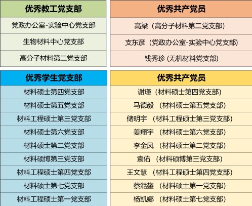 经评委投票,党政办公室-实验中心党支部等3个教工党支部、材料硕士第四党支部等9个学生党支部以及高梁等3位教工党员、谢瑾等9位学生党员获得年度优秀。
