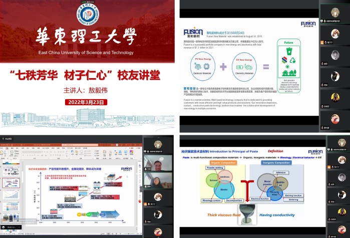 开展“七秩芳华 材子仁心”校友讲堂,凝聚校友力量,同心战“疫”。3月23日下午,常州聚和新材料股份有限公司(以下简称“聚和股份”)董事、研发副总敖毅伟受邀作《功能材料在光伏新能源及电子行业的应用》线上主题报告。本次活动有260余名师生线上积极参加,活动由国产自拍