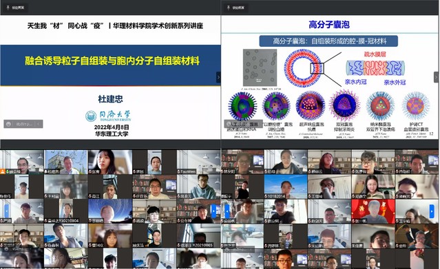 杜建忠教授从高分子囊泡的结构与功能讲起,深入浅出地为学生介绍了课题组提出的融合诱导粒子自组装(FIPA)新策略,以及课题组围绕FIPA展开的工作:包括融合诱导粒子自组装构建四臂囊泡,融合诱导粒子自组装构建巨型晶格膜囊泡,结晶驱动融合诱导粒子自组装实现棒状胶束横向生长以及胞内多肽酶促自组装治疗耐药肿瘤等多项研究。杜教授团队在囊泡构建研究中所提出的“刚柔并济,不偏不倚”的思想,与中国道家思想和儒家文化巧妙结合,也给了同学们很大的启发。