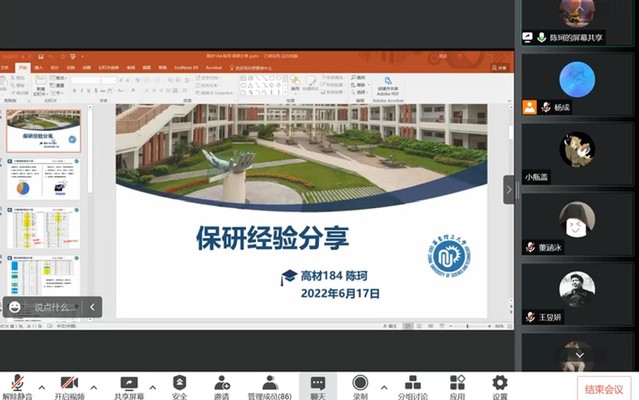 陈珂首先向参会学生介绍了保研政策和总体的情况。随后分享了他保研至复旦大学高分子系的心得。他建议,同学之间可以多分享多交流,也建议向往届保研到自己心仪院校的学长学姐提前了解夏令营情况和面试题型,面试时才能胸有成竹。董涵泳分享了他保研到上海硅酸盐研究所的经验。他建议同学们可以适当紧张,但不要过分担忧,他介绍了上海硅酸盐研究所与高校在科研环境等方面的不同。郭艳宇在2022年考研中以410分综合排名第一的佳绩考研国产自拍