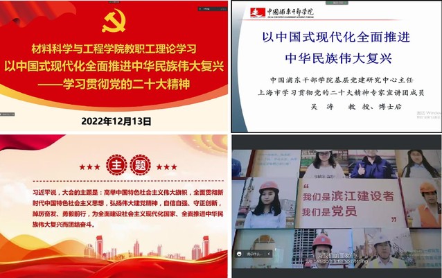 吴涛介绍了党的二十大召开的时代背景和重大使命,围绕报告十五个部分的核心内容进行了阐述,结合《习近平在正定》、“习近平总书记的读书故事”“互联网+社区治理”“徐汇滨江建设者之家”等一系列的影像资料,讲解了党的二十大报告中提出的新表述、新理念、新要求,阐释了中国式现代化提出的深刻背景与光明前景。他强调要把学习党的二十大精神与推动实际工作相结合,找到多样化的项目载体,如提升党组织“见微知著”“解决痛点堵点”精细化服务功能;整合材料学科优势,在新领域、新赛道上挖掘发展新动能等。
