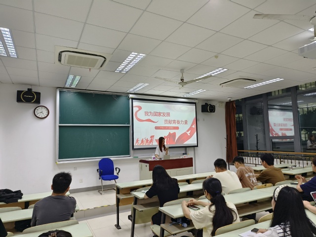 学硕224班在奉贤校区D108开展了“我为国家发展贡献青春力量”主题班会,班会由班长陶珊珊主持。
