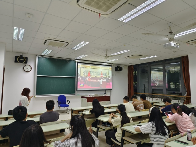陶珊珊介绍了主题班会背景,组织同学们学习观看了习近平总书记重要讲话的视频,带领大家学习了习近平总书记在中央政治局第五次集体学习时重要讲话精神。