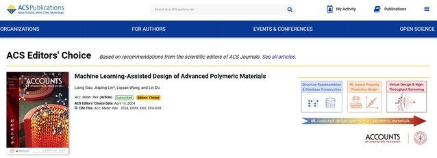 林嘉平教授团队受邀在美国化学会顶级期刊Accounts of Materials Research上发表题为“Machine Learning-Assisted Design of Advanced Polymeric Materials”的综述。由于该综述具有重要科学价值和引领性,入选美国化学会的ACS Editors' Choice栏目进行亮点报道。国产自拍