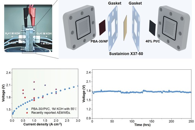 研究团队进一步利用同步辐射及原位谱学表征技术证明了局域Fe与Co位点之间的协同作用机制,即电子由Co-O-Fe结构基元向Fe位点转移,进而促进了高价态Co活性中心形成,同时有效避免Fe位点过度氧化而溶解失活。氧等离子体处理后的PBA催化剂在工业级电流密度下表现出优异的析氧反应活性和长期运行稳定性,在电流密度为1 A cm-2时,仅需276 mV的过电位;用该催化剂为阳极材料组装的AEMWE制氢系统仅需1.76 V便可达到1.0 A cm-2的制氢电流密度,并能持续运行超250 h而无明显衰减。这项工作克服了传统非贵金属催化剂在工业级电流密度下稳定性差的难题,为平衡催化剂活性和稳定性的材料结构设计提供了新的思路。