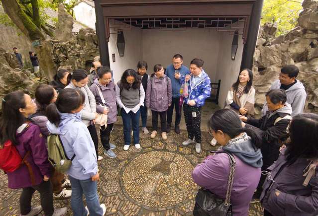 跨过小桥流水,穿过石街古巷,老师们先来到了退思园。这是由光绪年间代理按察使任兰生被罢官返回故里后花费10万两白银建造的一座小巧而精致的私家园林,园名来自《左传》中的“林父之事君也,进思尽忠,退思补过”之意,寓意反思自己的过去,修正错误。老师们穿厅过堂,在导游的讲解中细细品味中国古建筑的巧思和蕴涵的人文情感与礼仪文化,在亭台楼阁、廊桥水榭间徜徉,领悟园林小品、匾额对联和铺地花样中隐喻的人生哲理。