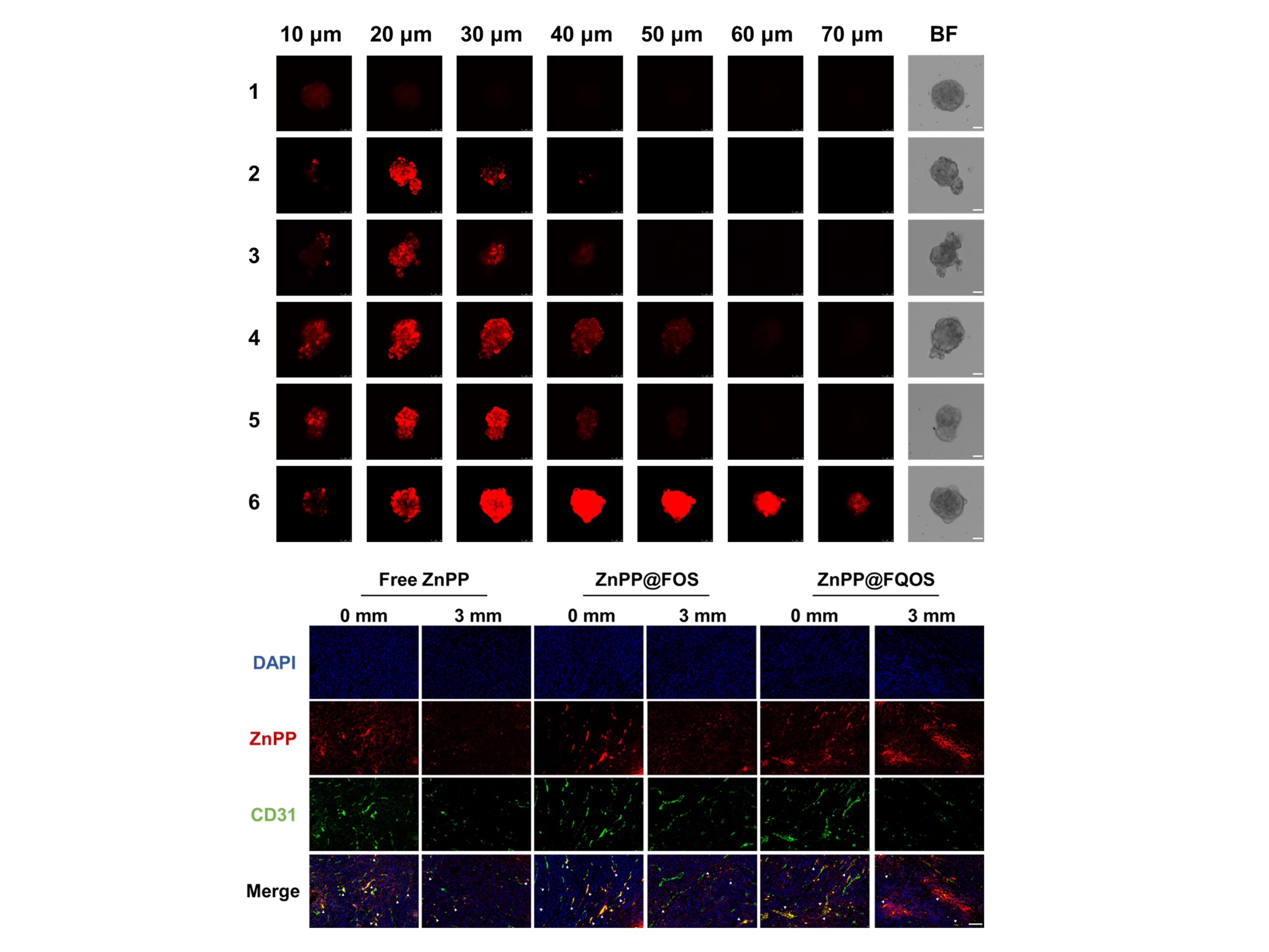 研究团队进一步在细胞及活体层面分别验证了ZnPP@FQOS的深层组织穿透能力(图2)。细胞层面上构建了肺癌细胞(KP)与CAFs(3T3)共混的多细胞肿瘤球作为体外模型对纳米药物组织渗透能力进行评估,结果表明ZnPP@FQOS在弱酸性条件下能够成功渗入平均直径为120 μm的肿瘤球内核,在70 μm处有较强荧光分布,具有良好渗透能力。活体层面上对浅层(0 mm)以及深层(3 mm)的肿瘤组织进行切片,并且对血管进行染色,发现ZnPP@FQOS相较于其他两组药物有明显的深层组织荧光积累及更远的血管渗透距离,说明该纳米药物具有良好的肿瘤组织渗透能力。